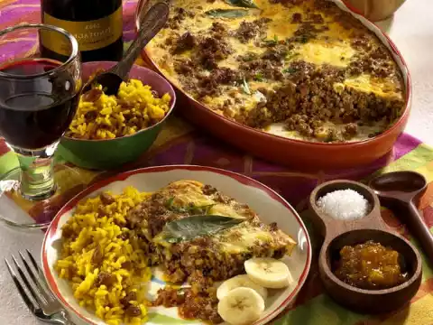 Preheat oven to 180 °C (circulating air: 160 °C). Heat 2 tablespoons of oil in a frying pan and stir-fry the minced meat in three portions until crumbly. Place all portions in the pan, add steamed onions and garlic, tomatoes and chutney. Let it simmer for about 10 minutes until it becomes a thick sauce. Season to taste with lime juice, salt and pepper and pour into a rectangular casserole dish (approx. 24 x 18 cm).