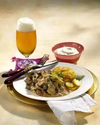 Stir in sour cream by the spoonful at low temperature, season to taste again. Serve Boeuf Stroganoff and fried potatoes in portions, sprinkled with cucumber strips and dill.