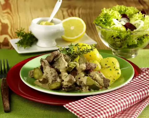 Melt the butter. Toss potatoes in it and sprinkle with parsley. Add meat to the sauce, bring to the boil briefly and remove from the heat. For the vinaigrette, mix vinegar and 1 pinch of mustard. Stir in 3 tablespoons of oil and season with salt, pepper and a little sugar.