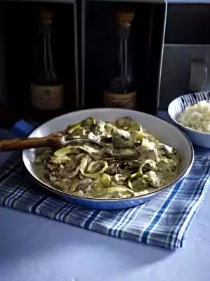 Dust the mushrooms with flour and sauté briefly. Deglaze with 400 ml water. Bring to the boil, stir in broth, sour cream, mustard, sugar and gherkins and simmer for about 3 minutes. Stir in meat and heat up briefly (do not boil!). Season with salt, pepper and 1 pinch of sugar. Rice tastes good with it