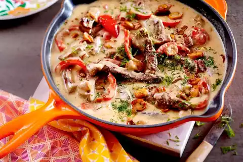 Heat 2 tablespoons of oil in a frying pan. Fry the meat in portions on all sides over a high heat. Season with salt and pepper and remove. Heat 1 tablespoon of oil in the frying fat. Sauté the mushrooms in it. Add paprika and onion and fry for about 2 minutes. Season with salt, pepper and 1⁄2 TL paprika powder. Add stock and stir in mustard. Bring to the boil and simmer for about 5 minutes.