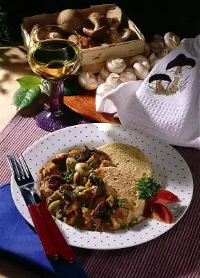 Clean, wash and quarter mushrooms and shiitake mushrooms. Peel and finely chop the onion. Heat the fat in a pan and fry the onion until transparent. Add the mushrooms and fry. Add porcini mushrooms with the soaking water and let it boil down a little. Mix sour cream and starch and slowly stir into the mushrooms. Bring to the boil briefly and season with salt and pepper. Wash the chives, dab dry, cut into fine rolls and sprinkle on top. Cut Bohemian dumplings into slices with the help of a thread and arrange on plates with the mushroom ragout.