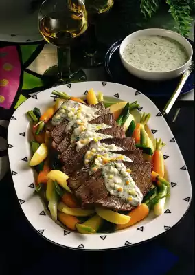 Let the sauce boil for about 10 minutes at low heat. Wash the herbs, dab dry, chop and add to the sauce. Season to taste with salt, pepper and horseradish. Arrange the vegetables on a plate. Cut meat into slices, place them on the vegetables and cover with the sauce. Sprinkle with chopped egg