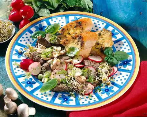 Add herbs. Whip the oil underneath. Cut meat into thin slices. Mix the meat, radishes, mushrooms and spring onions, pour the marinade over it and let it stand for about 1 hour. Wash the sprouts and drain well on a sieve. Serve the salad sprinkled with pepper and sprouts. Garnish with basil and radishes as desired. Serve with herb-garlic baguette