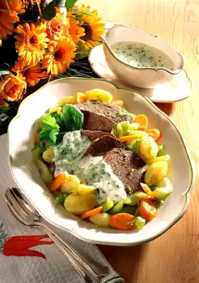 Heat the fat in a pot and sauté the flour in it. Deglaze with 1/4 litre stock and milk and boil thoroughly while stirring. Season to taste with salt, pepper and horseradish. Wash the herbs, chop finely and add.