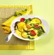 Cut the meat open and arrange it covered with the vegetables and some sauce. Remaining sauce extra is enough.