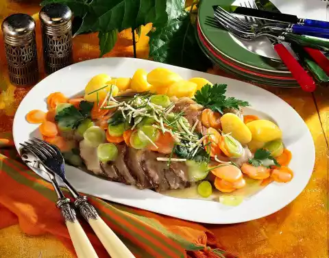 Season the sauce with horseradish, salt, pepper and lemon juice. Take the roast out of the broth and cut it open. Arrange with the vegetables on a preheated plate. Pour some sauce over it. Wash the chives and cut into small rolls.