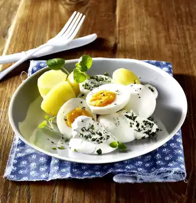 Put the eggs in boiling water and boil them for about 8 minutes until soft. Drain the potatoes. Quench eggs, peel and possibly halve them. Arrange potatoes, eggs and herb sauce on plates and garnish with remaining marjoram.