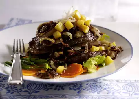 Cut the boiled fillet of beef into approx. 1 1⁄2 cm thick slices. Remove the potatoes. Heat 2 tablespoons of butter in the frying fat. Fry meat slices in it in 2-3 portions on each side for 1-2 minutes. Serve, sprinkle with horseradish.
