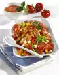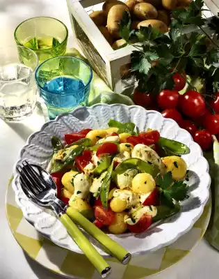 Clean, wash and cook for 3-5 minutes in boiling salted water. Drain and allow to cool. Wash, quarter or slice the tomatoes