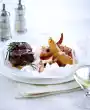 Fry the meat in a coated pan in hot oil. Add the onion and fry briefly. Season with salt and pepper. Dust meat with flour and sauté briefly. Stir in vegetable water, bring to the boil and simmer for about 5 minutes, stirring continuously.