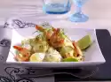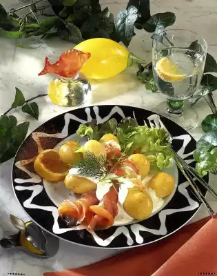 Mix crème fraîche, sour cream, herbs and mustard seeds. Season with salt, cayenne pepper and mustard. Peel the potatoes. Serve with cream dip and salmon on the salad leaves. Garnish with remaining herbs and lemon slice.