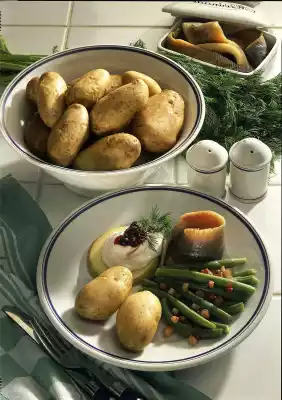 Wash the potatoes, brush them thoroughly and boil them in salted water for about 20 minutes. Meanwhile, clean the beans and cook in little boiling salted water for about 15 minutes. Wash the matie fillets and dab dry.