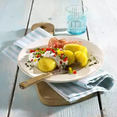 Wash the potatoes and cook in boiling water for about 20 minutes. Clean, wash and cut the peppers into very fine cubes. Stir quark smooth and season with salt, pepper, sugar and lemon juice.