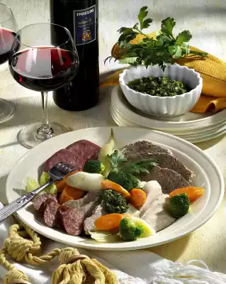 Peel or clean and wash the carrots, celery, leek and 2 onions. Halve the onions. Tie 300 g carrots, celery and 1 stick of leek to a bunch. After 1 hour, add the onions, chicken and veal to the beef and cook for 1 hour. For the sauce, wash the parsley and pluck. Peel garlic and 1 onion, dice roughly. Puree everything with anchovies, capers, vinegar and oil. Season to taste with pepper. Clean and wash broccoli and fennel. Divide broccoli into florets. Cut fennel into slices, rest of carrots and leek into slices or pieces.