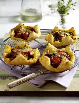 Spread the slices of dough on two baking trays lined with baking paper. Put Bolognese in the middle of the pastry slices and sprinkle with cheese. Fold the pastry corners towards the middle. Whisk the egg yolk and milk and brush the edges of the dough with it.