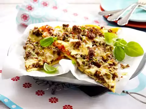 Cover pancakes with tomatoes and sprinkle with herbs. First spread minced meat, then cheese on top and bake for about 15 minutes. Remove, garnish with basil and cut open.