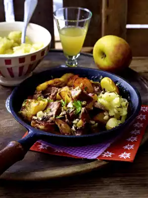 Dice roast beef. Add to the potatoes with onions and garlic. Fry for another 5 minutes. Season to taste with caraway seeds, salt and pepper. Add apple compote.