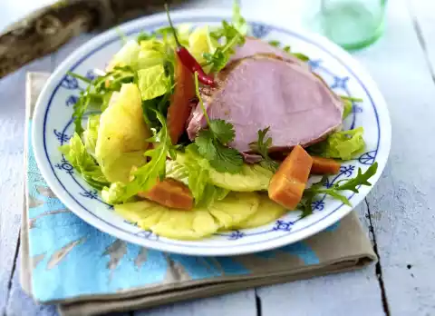 Fold in the lime vinaigrette. Remove the casserole from the oven and cut open. Serve the cured pork loin and salad with some cocktail sauce. Add the remaining cocktail sauce. Garnish with chilli and coriander.