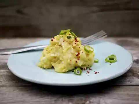Mix potatoes, eggs and sauce well. Season to taste with salt and pepper. Serve hot. Sprinkle with spring onion and chili flakes.