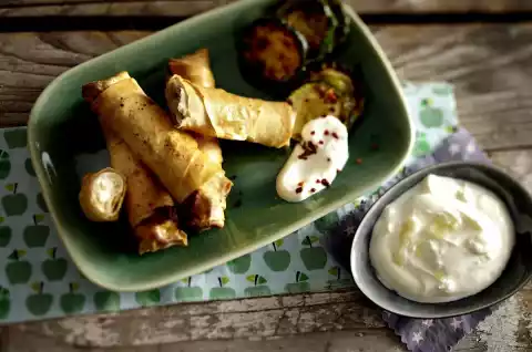 Peel and coarsely chop the garlic. Mash 1/4 tsp salt and garlic finely in a mortar. Mix yoghurt and garlic paste. Arrange "cigars", zucchini and yoghurt