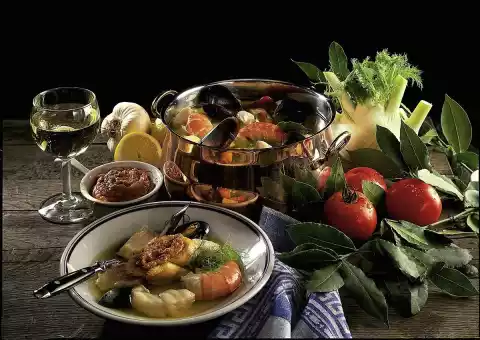 Wash the lobster crabs and remove the intestines. Pour fish stock through a sieve. Return to the pot and let the fish pieces and lobster crabs steep in it for five minutes. Add the mussels and let them simmer for another five minutes. Season to taste with salt and pepper and lemon juice. For the croutes, warm olive oil in a pan, fry the baguette slices briefly and rub with a peeled clove of garlic. Serve the soup in plates, brush one slice of baguette with rouille and place it on the soup.