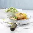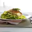 Let simmer for about 15 minutes. In the meantime wash, clean and halve the sugar snap peas. Wash the salmon and loach fillets, dab dry and cut into medium-sized pieces. Season with salt and pepper.