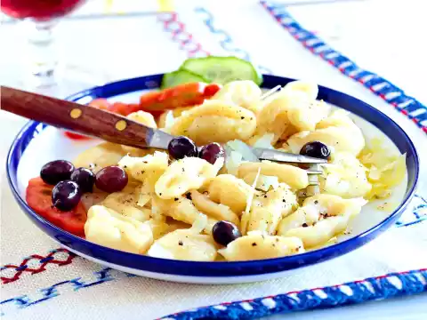 Divide the dough into 6-7 pieces and form into thin rolls (approx. 2 cm Ø) on a floured work surface. Cut the rolls into pieces about 2 cm wide. Press in pieces one by one with your index and middle finger, rolling or pulling towards the body. Place the finished pasta on a floured baking tray