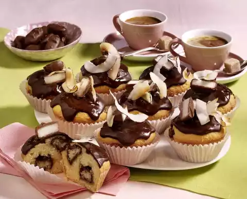 Line the recesses of a muffin tray (12 recesses) with paper sleeves. Cream fat, sugar and vanilla sugar with the whisk of the hand mixer. Stir in the eggs one by one. Mix flour, grated coconut and baking powder and stir in alternately with the milk and liqueur. Fill the dough and 2 bounties into each bowl. Bake the muffins in the preheated oven (electric cooker: 175 °C/ convection oven: 150 °C/ gas: level 2) for 25-35 minutes.