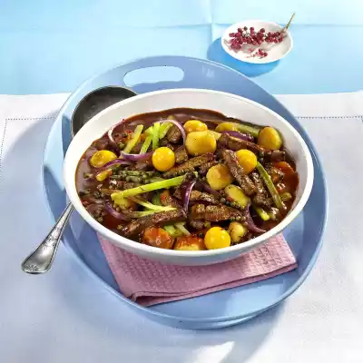 Heat clarified butter in a large pot. Brown the meat all around. Add the onion, garlic and celery and fry until transparent. Deglaze with red wine, beef stock and cream. Stir in tomato paste. Season to taste with salt, cayenne pepper and sugar. Drain and add green pepper. If necessary, cut tomatoes in half and add. Simmer for 5 minutes. In the meantime heat oil in a pan and fry gnocchi in it until golden brown all around.