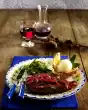 Peel the garlic and press it through a garlic press. Peel the onions and cut them into slices. Clean and wash the celery and cut into fine strips. Clean and wash the tomatoes. Wash the meat, dab dry and cut into strips.
