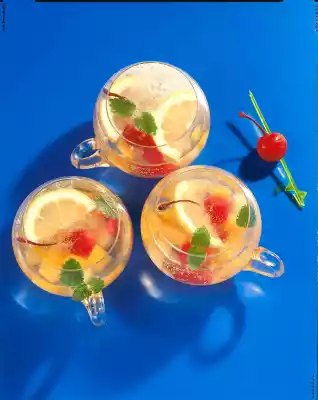 Wash lemons thoroughly and rub dry. Halve lengthwise and then cut into thin slices. Pluck the lemon balm leaves from the stalks. Pour the cocktail fruit with juice into a large punch bowl. Add lemon slices, lemon balm leaves and, if desired, cocktail cherries. Pour in wine and mineral water. Fill up with sparkling wine shortly before serving