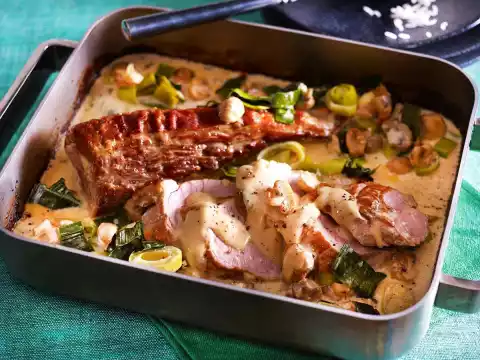 Braise in the preheated oven (electric cooker: 200 °C/ convection oven: 175 °C/ gas: level 3) for 20-30 minutes. Remove the meat, leave to rest briefly in a warm place and cut into slices. Serve with the creamed vegetables. Serve with rice.