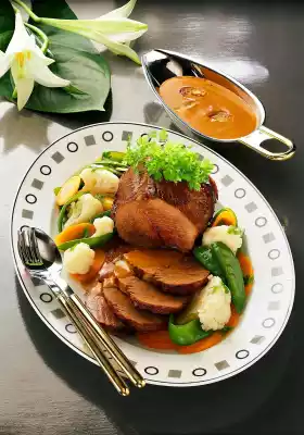 Braise in a closed pot for 1 3/4 - 2 hours. Little by little pour on the remaining red wine. Clean and wash the vegetables. Divide cauliflower into florets, cut carrots into slices. Cook the prepared vegetables in 1/2 litre boiling salted water with 1 pinch of sugar for about 10 minutes.