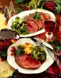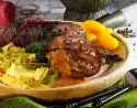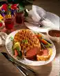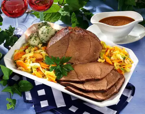 Let it swell for about 10 minutes. Form 8 dumplings from the potato dough with moistened hands. Leave to stand in plenty of boiling salted water for about 20 minutes. Heat the fat. Sauté carrots in it. Add 5 tablespoons of water and steam covered for about 5 minutes. Keep meat warm. Puree the soup vegetables in the stock. Bring to the boil and thicken with sauce thickener. Season to taste with salt, pepper and vinegar. Add cabbage to the carrots and heat up with them. Season to taste with salt and pepper. Arrange roast, vegetables and drained dumplings. Garnish with parsley. So