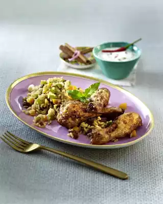 Remove the chicken legs. Add spring onions to the rice and stir in. Arrange rice and legs on plates and garnish with mint. Serve with a chilli-yoghurt dip