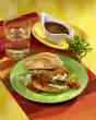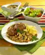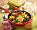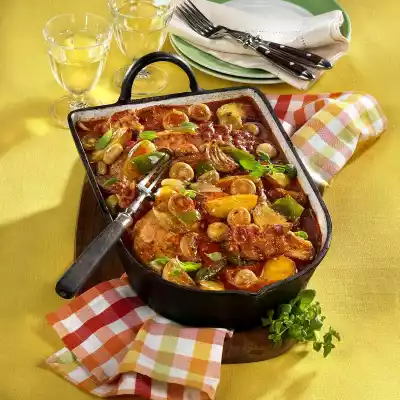 Fry meat on each side for about 2 minutes, remove. Fry potatoes in hot frying fat for about 5 minutes. Add onions, mushrooms and paprika and fry for 3-4 minutes. Turn several times. Add tomato paste and herbs, sweat briefly. Season meat and vegetables with salt and pepper. Chop the tomatoes coarsely. Add to vegetables. Add 250 ml water, bring to the boil. Stir in stock, season to taste with salt, cayenne pepper and sugar. Take out 1/4 of the vegetable sauce.