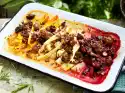 Drain the potatoes and apples. Add butter and milk. Mash coarsely with a potato masher. Season to taste with salt and nutmeg. Arrange meat, vegetables, bacon and mashed potatoes. Sprinkle with nuts.
