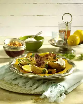 Arrange in a bowl and sprinkle with chopped walnuts. For the second dip, mix goat's cheese and quark, season with pepper and arrange in a small bowl. When the potatoes are done, remove the lid.