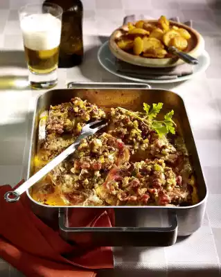 Season chops with salt and pepper and place them in a large ovenproof dish with lid. Add minced meat to the hot frying fat and stir-fry gently. Finally add 2/3 of the onions and fry briefly.