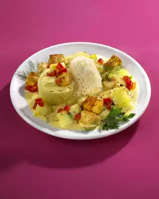 Deglaze with stock and cook for about 7 minutes. Stir sour cream and flour until smooth. Take the cucumber pieces aside for filling. Stir the sour cream into the pan, bring to the boil briefly. Season with salt, pepper and chopped dill. Arrange the rice, 1 piece of cucumber for each filling and the ragout in portions. Sprinkle with tomato cubes. Serve garnished with fresh herbs