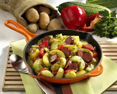 Cut the cucumbers into pieces. Peel onion and chop finely. Cut Cabanossi into slices. Drain potatoes, chill and peel. Heat oil in a large pan. Fry the potatoes for about 3 minutes and take them out.