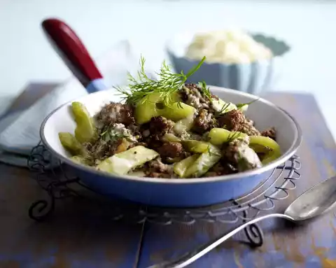 Season with salt and pepper. Prepare rice in boiling salted water according to package instructions. Remove minced meat from the pan. Heat 1 tablespoon of oil in a frying pan. Fry the cucumbers for 3-5 minutes. Add minced meat.