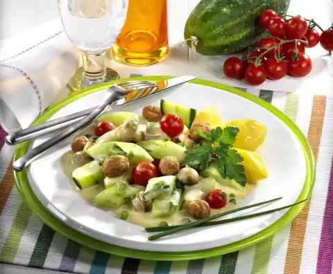 Fry the cucumber for about 5 minutes while turning. Meanwhile, peel and wash the potatoes and cook in salted water for about 20 minutes. Deglaze cucumber with 250 ml water. Season with salt and pepper, cook for about 15 minutes at medium heat. Melt 1 tablespoon of fat in a pan. Brown the mushrooms in it. Season with salt and pepper. Deglaze with cream and another 200 ml water. Let it boil down for 5 minutes. Wash and clean the tomatoes. Add cucumber with the liquid, meatballs and tomatoes.