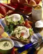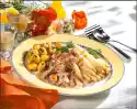 Add sauce thickener, bring to the boil. Season again with salt and pepper. Wash chives and cut into small rolls. Stir into the ragout. Drain the potatoes. Serve ragout and potatoes garnished with fresh herbs