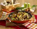 Deglaze with wine and cream and simmer for about 5 minutes. Add carrots and stock. Stir in cheese and let it melt. Add sauce thickener while stirring, bring to the boil again and season to taste. Drain the pasta and let it drain. Arrange the ragout on plates and serve garnished with fresh herbs