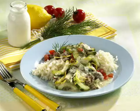 Drain the rice and serve with the ragout. Garnish with dill. Sprinkle with lemon zests.