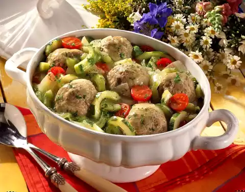 Peel, halve and roughly dice the vegetable onion. Heat the fat. Sauté the vegetable onion in it. Add the cucumbers, cover and steam over a mild heat for 10 to 15 minutes. Let the meatballs simmer in boiling salted water for ten minutes.