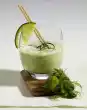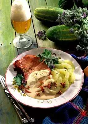 Meanwhile cook the cucumbers in boiling broth for about 10 minutes. Season with salt, pepper and prepared borage. Take the chops aside. Keep warm. Fry the onions and chanterelles in the frying fat. Deglaze with cream and boil down for about 2 minutes at high heat, stir in sauce thickener, bring to the boil again and season with salt and pepper. Serve everything garnished with fresh herbs