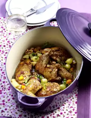 Cut the pancetta into small cubes. Clean, peel and dice the onions, carrots and celery. Wash the meat, remove quills if necessary. Dab meat dry. Cut chicken into 6 pieces. Cut the breast fillets in half again